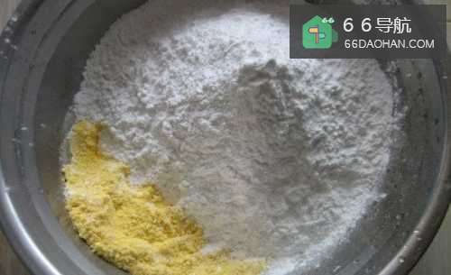 把玉米粉倒进糯米粉内,均匀搅拌,让两者混合在一起。