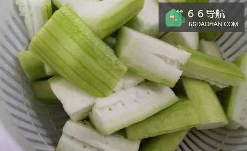 1,嫩丝瓜去皮切成小段,嫩丝瓜是不用去籽的。