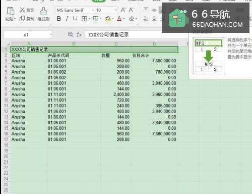 4在插入的【行】中,输入表头内容(如,XXXX公司销售明细表),然后点击【合并单元格】;