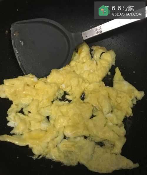 2锅烧热下鸡蛋,关火,翻炒鸡蛋切块。