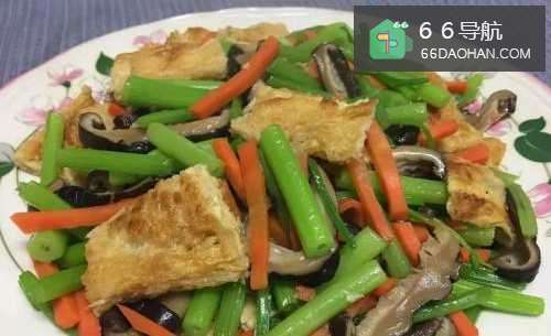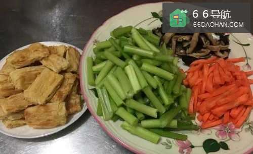 3煎好香干切长块;红萝卜去皮切粗丝;泡软的香菇拧干水切丝;芹菜挑掉叶子,折掉老的头,洗干净,切段