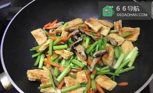 5随后放入香干、芹菜、盐、鸡精少许提味,炒匀,煮熟即可熄火