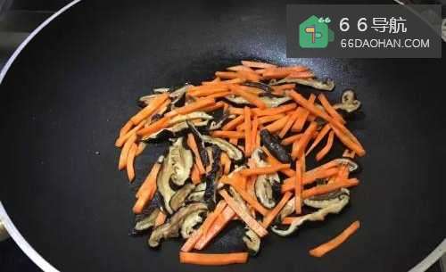 4锅内放入少许油,爆香香菇丝,再放入红萝卜丝,炒一炒,再加入少许水煮一下,让香菇和红萝卜稍微煮出味和熟