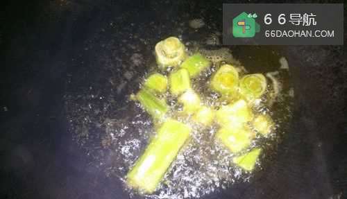 6开火上锅,下入适量的油之后,先把葱花炒香,然后下入猪肉片炒熟。