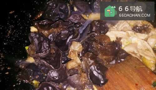 7猪肉片炒熟之后,下入木耳,炒一会之后把蒜末加入,然后再一起炒出蒜香味。