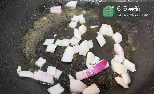 5洋葱切末,放入锅中炒香,再放入八角、桂皮、香叶翻炒;