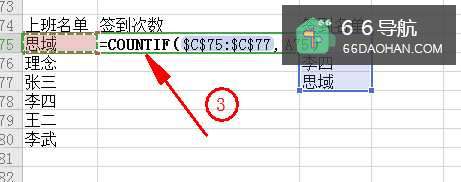 3输入函数=COUNTIF($C$75:$C$77,A75)(里面的单元格数指你所填写表格的地方)