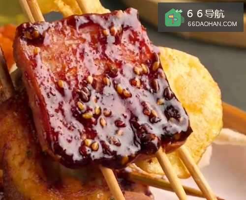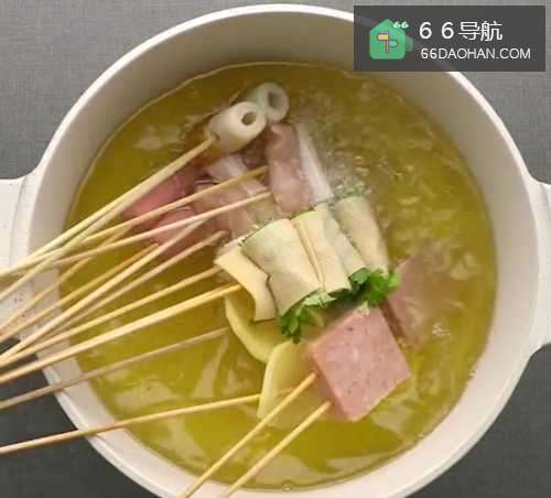 3起锅烧油,油温67成热放入串好的食材,炸熟!