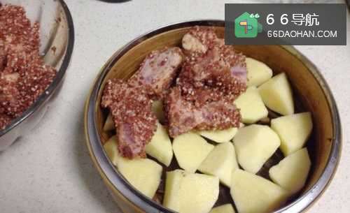 给土豆加一点盐,搅拌均匀后摆在蒸茏底部,将排骨铺在土豆上面。