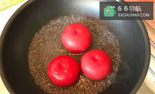2番茄洗净,锅里烧开水放入番茄煮一小会