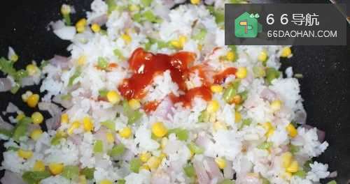 6将米饭炒散后,放入番茄酱翻炒均匀盛出备用。