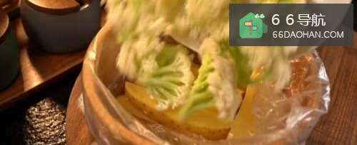 2土豆菜花放进碗中,记得用保鲜袋装,加入生抽,椒盐,辣椒面,孜然粉。