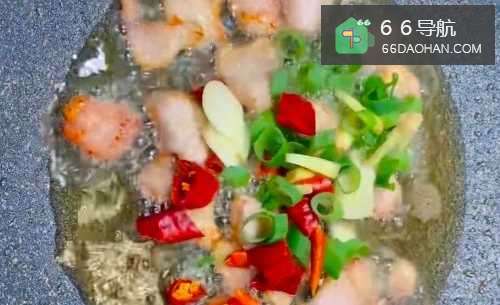 3另起锅烧油,油热倒入五花肉,炒至变色、加葱姜蒜和干辣椒,爆出香味。