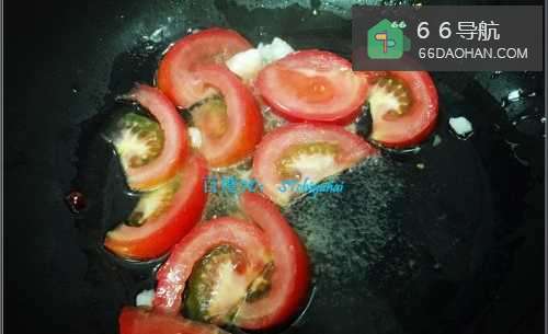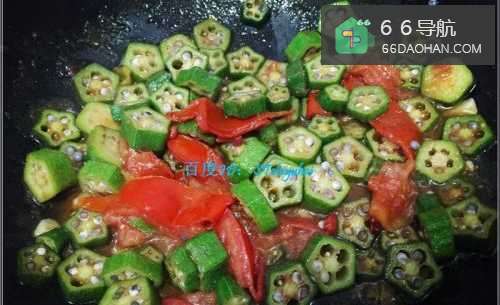 6先加入西红柿炒一会,炒出些许汤汁,然后倒入腌制的秋葵,混合翻炒。