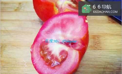 4将西红柿清洗干净,然后对半切开,剜去蒂头部分,沿着中线切成小瓣状。