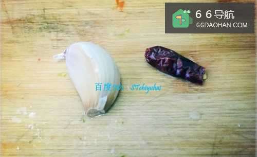 5准备少许蒜头、辣椒干,分别处理成蒜末、辣椒段。