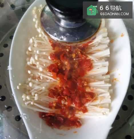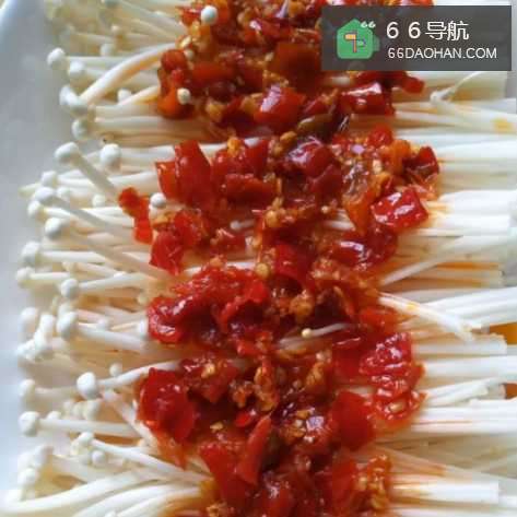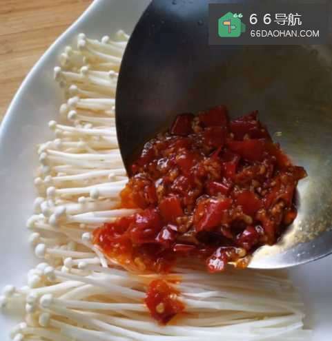 4再放入剁椒酱,小火炒香,把炒好的剁椒酱浇在金针菇上;