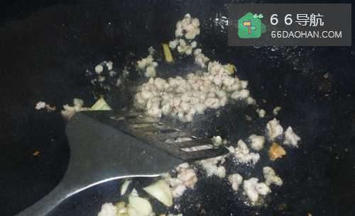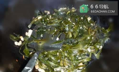 4倒入海带丝翻炒,加入一勺盐、小半勺糖,适量料酒。