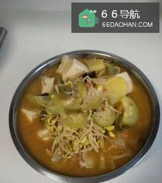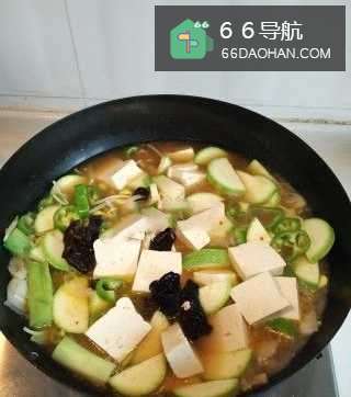 加入黄豆芽、豆腐、木耳、土豆、大葱,烧开后改中火,盖锅盖炖10分钟。