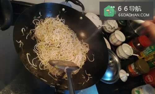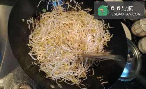 5第五步,倒入豆芽翻炒一会,让麻辣味侵入豆芽中。
