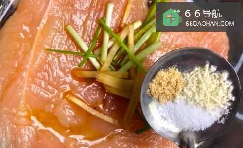 2再用刀背在鸡胸肉上边敲打一下,方便入味,再加上葱丝和姜丝,一勺料酒、适量盐、鸡精和胡椒粉,少来点奥尔良腌料,按摩均匀腌制15分钟。