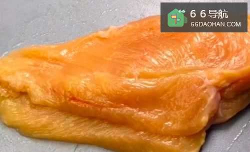 准备一块新鲜的鸡胸肉,对半劈开,不要切通。