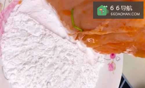 3然后再把腌制好的鸡排两面先沾上一层干淀粉。