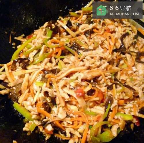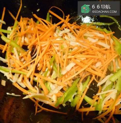 5第五步将事先切丝的木耳尖椒胡萝卜翻炒,捞出备用