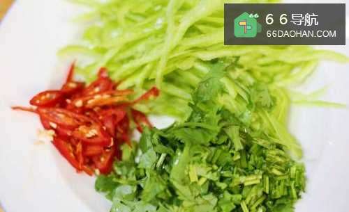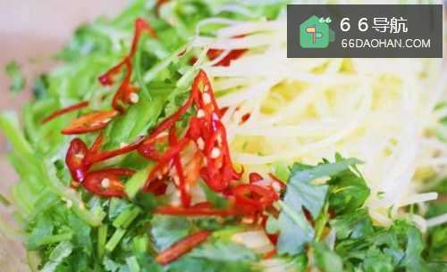 10把小米椒、尖椒、香菜倒进土豆丝里