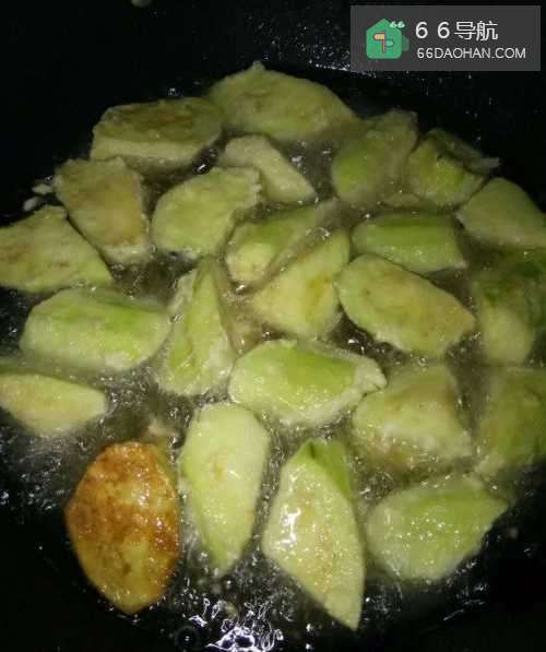 4将茄子下入锅里,炸至表面金黄,捞出;