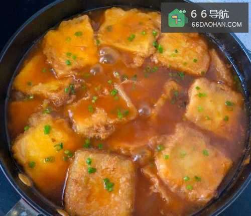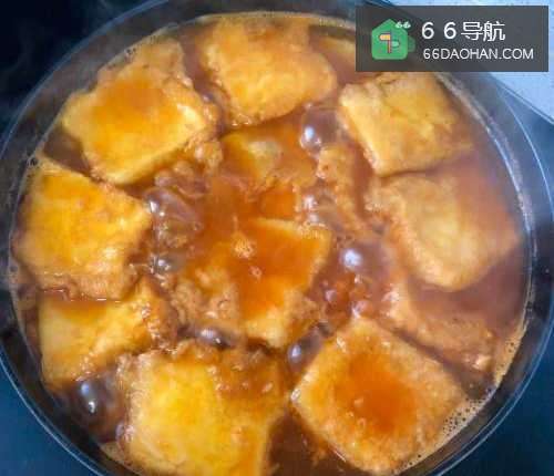 9把豆腐放进平底锅,将调味汁倒进去,开中火煮沸后转至小火