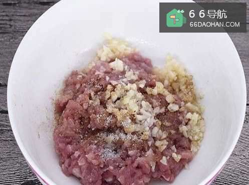 2瘦肉剁碎后放入蒜末,胡椒粉和盐搅拌均匀腌制一会;