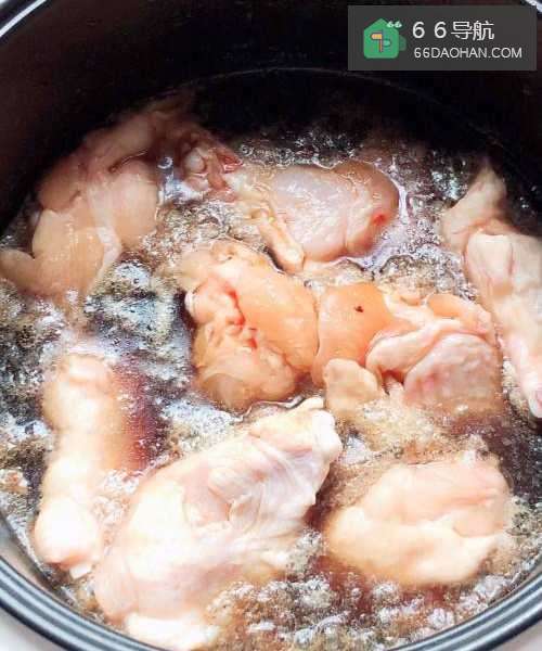 3腌制完成后,将腌制的鸡翅及碗中的酱料和姜片一同倒入电饭煲中,同时加入可乐,没过鸡翅即可,再按下煮饭键就可以了;