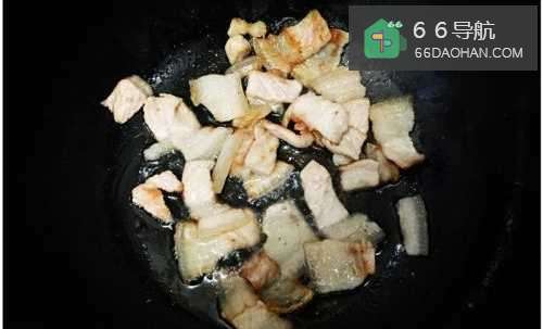 7榨猪油的过程要不时翻动猪肉片,不要让其粘锅,一边炸一阵后翻转至另一边,待肉片略微显黄色开始加入少许蒜末、生姜、辣椒干,翻炒一会,加入火腿片,加大火候快炒一会。