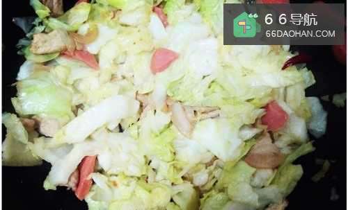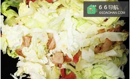 8开始加入沥干的包菜,加入少许热开水,开大火快炒,要快速翻动,尽量不要让火腿粘在锅底。