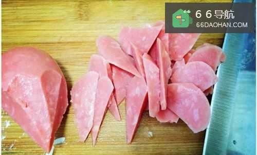 4将准备好的火腿剥去外包装,用滚刀切法,将火腿切成小片状,滚刀切法比较好切,平切火腿薄片,会比较粘菜刀,将切好的火腿装盘备用。