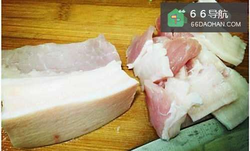 5处理猪肉,先将猪肉洗净,如果不喜欢吃猪皮,可以将猪皮整块剔除,用切肉刀将其切成薄片,尽量薄一些,这样等下熬猪油时会比较容易,将切好的猪肉片装盘。