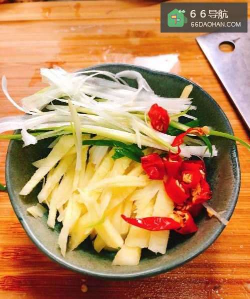 4下一步,切葱丝、姜丝和辣椒圈备用;