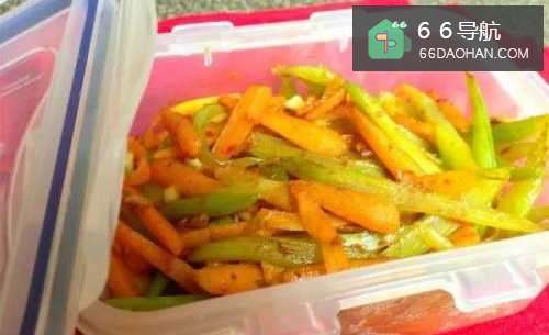 芹菜、胡萝卜切丝,大蒜切末,胡萝卜先用微波炉热一下
