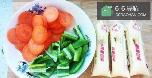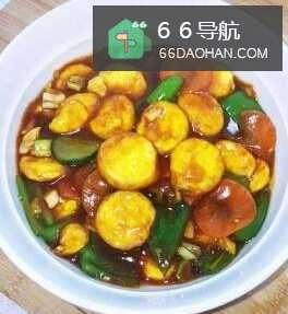 7留底油,葱蒜爆香,倒入胡萝卜,青椒大火爆炒一会后倒入事先调好的料汁以及炸好的日本豆腐,翻炒均匀,小火收汁即可出锅