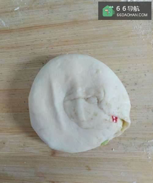 5第五步,把裹好的面团用手压一下,继续用擀面杖擀成圆形。