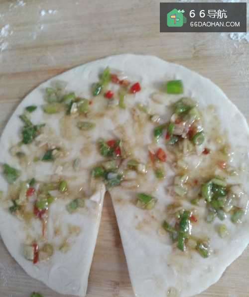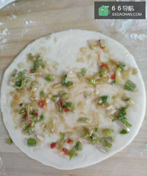 3第三步,在擀好的面团上面涂上搅拌均匀的葱油。