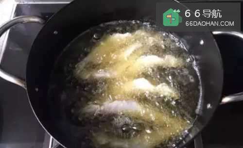 66、炸锅里放入适量植物油,烧至6成热,放入沙丁鱼,中火慢慢炸至金黄,中间翻面两次。