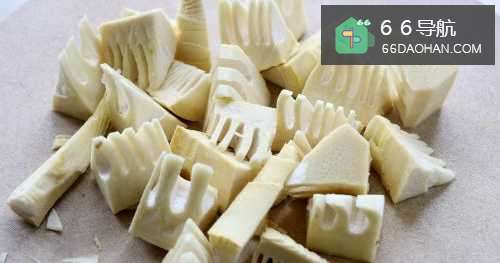 2春笋切皮,切成小块,开水锅里放适量的盐,放入笋块焯水10分钟左右;