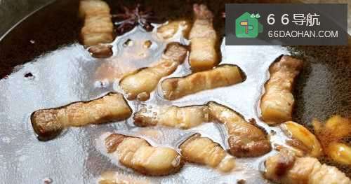 4锅内放入花椒八角、生姜、大蒜、爆出香味,放入冰糖,放入五花肉翻炒均匀;