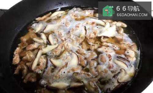 4用中火爆香姜末、蒜末,然后倒入笋、香菇、黑木耳略炒,炒香配料后,倒入高汤和水,加入盐、太白粉和麻油调味