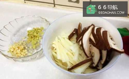 2竹笋、香菇、黑木耳切丝;蒜、姜切末