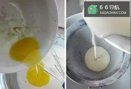 3融化的黄油倒入面糊中搅匀,有小疙瘩也没有关系,接着面糊过筛,筛子上的小面疙瘩用刮刀碾压后,把筛子浸到面糊里再筛一遍;