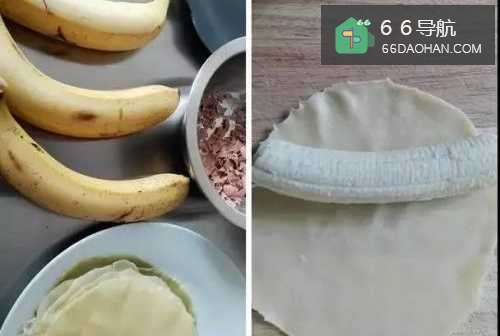 8准备香蕉,巧克力屑(用勺子在大块的甜巧克力背面刮),香蕉去皮去掉2头,放在面皮上挨着锅底的一面;