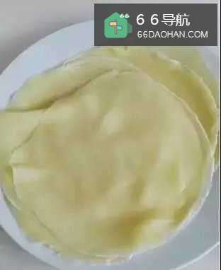 5平底锅中放入一勺面糊,快速转动锅子让面糊流向四周,开小火加热,面糊全部凝固变色微微鼓泡,快速揭下面皮放入盘中;锅中不放油,面皮无需翻面;
